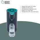 • Boils water to 100°C to eliminate bacteria, then cools it to 70°C for safe formula preparation.