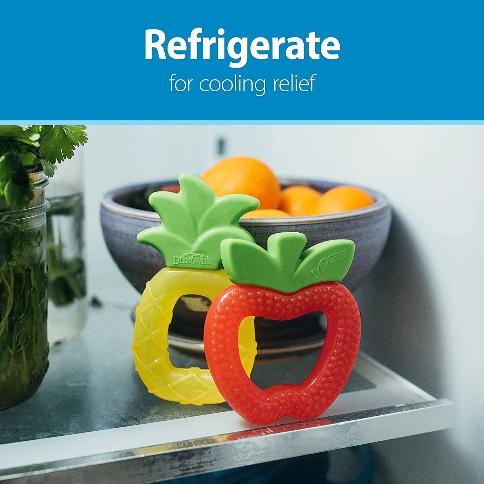 - Baby teething toy can be placed in the refrigerator for cooling relief.