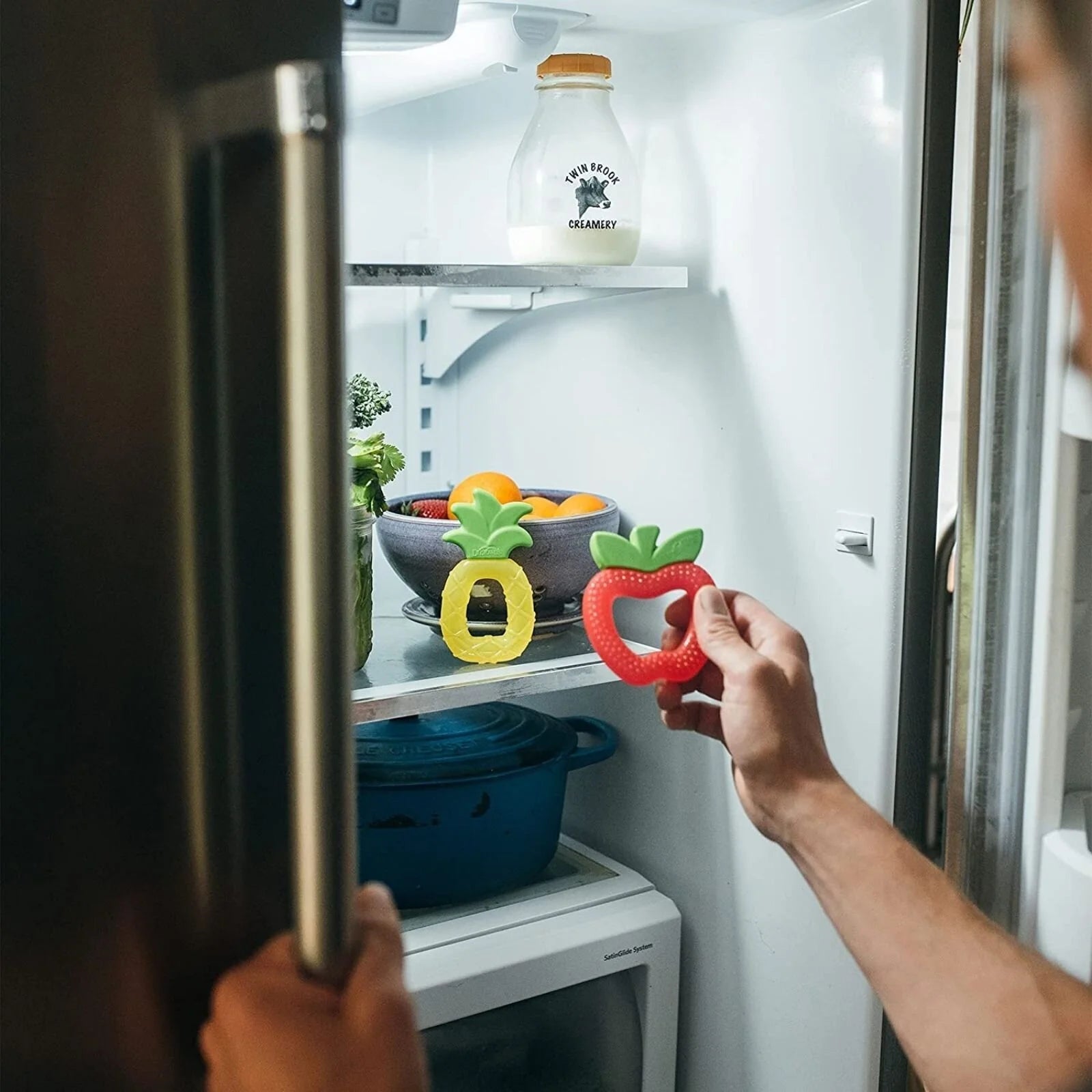 - This refrigerator-safe water teether features solid leaves designed for little hands to comfortably hold even when cold.