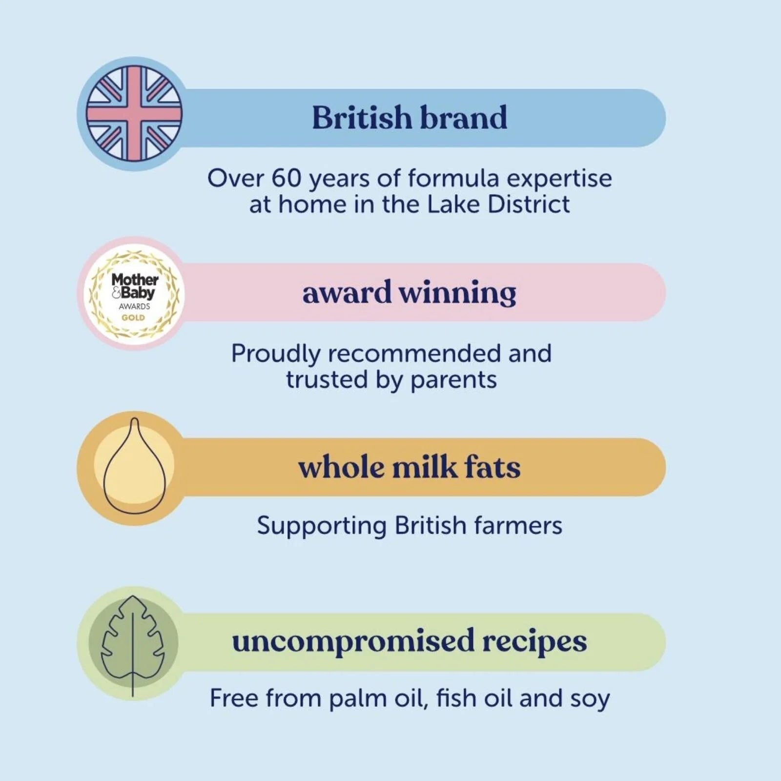 We’re 100% British brand and don’t do palm oil, fish oil or other cheap additives. What we do do is locally sourced whole milk, plant- based DHA and 3’-GL. Simple.