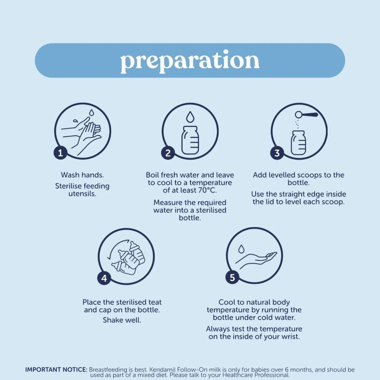 - Wash hands, then sterilise your feeding utensils according to manufacturer’s instructions.