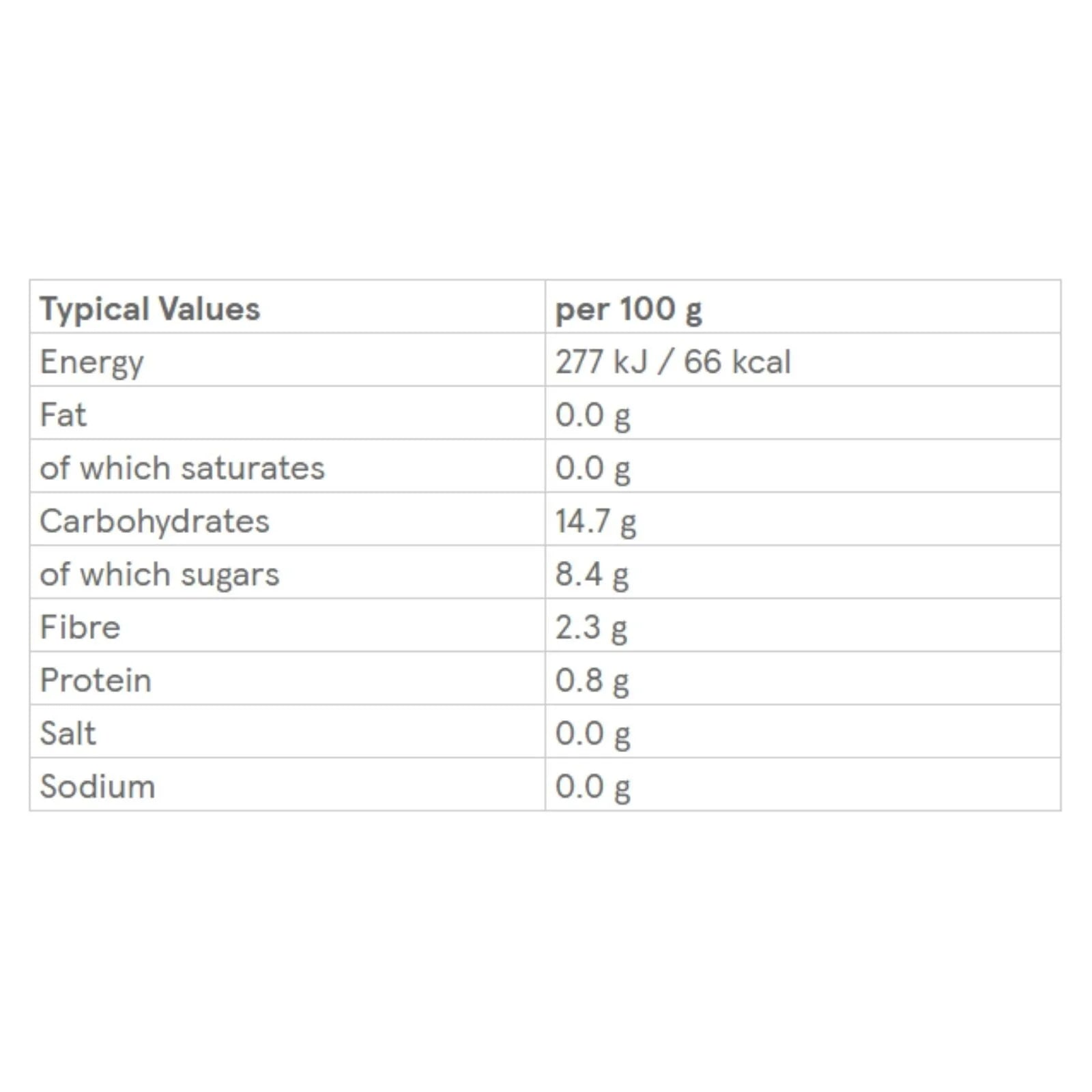 Nutritionals: Energy 277kJ / 66kcal, Fibre 2.3g, Fat 0.0g, of which saturates 0.0g, Protein 0.8g, Salt 0.0g, Carbohydrates 14.7g, of which sugars 8.4g.