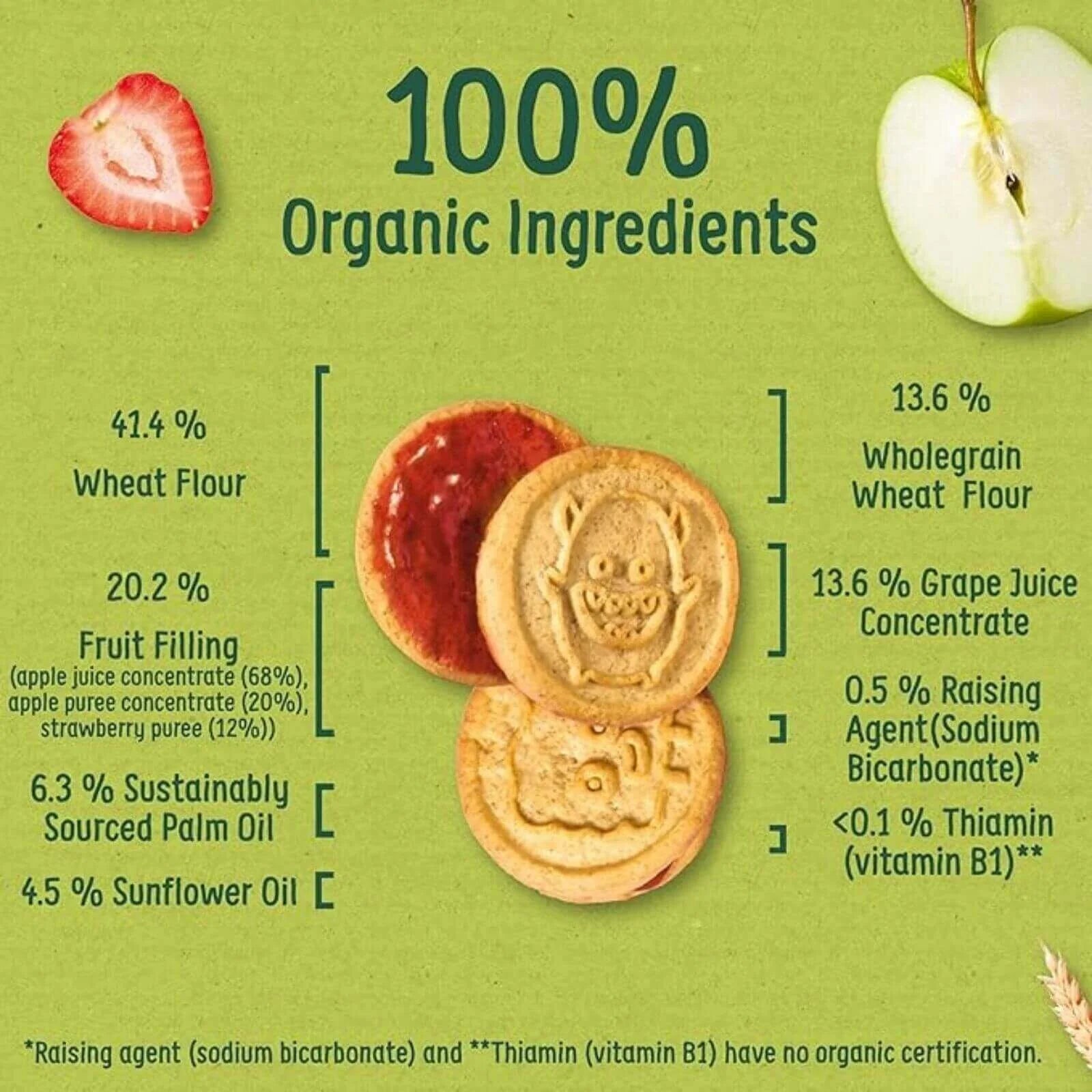 Crafted with organic fruit juices and purees from apples and strawberries, these biscuits offer a deliciously wholesome snack option.