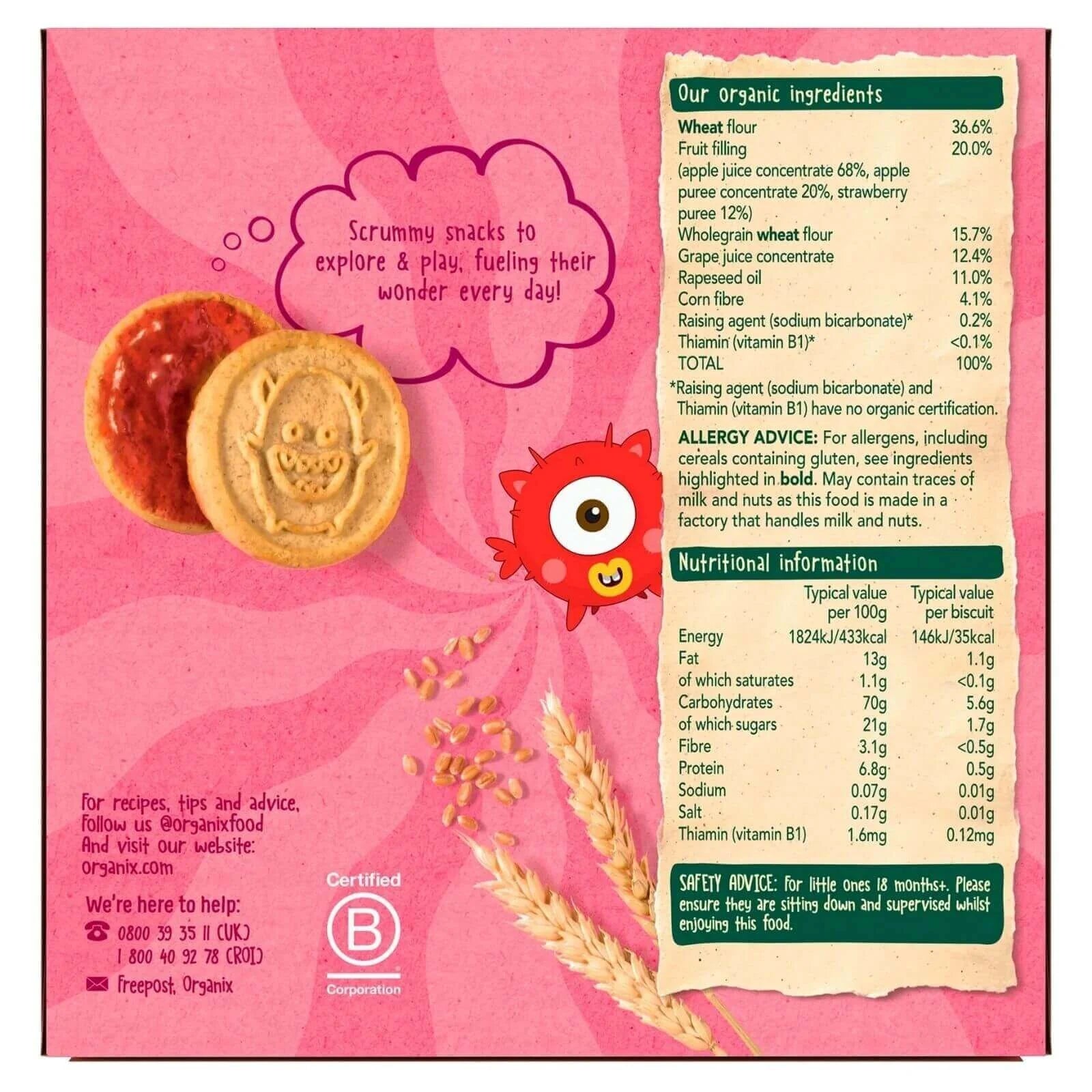 Organix Jammie Monsters are a nutritious alternative to traditional mini jam-filled biscuits. With their fun monster design, these jam sandwich biscuits are an exciting treat for toddlers aged 18 months and older.