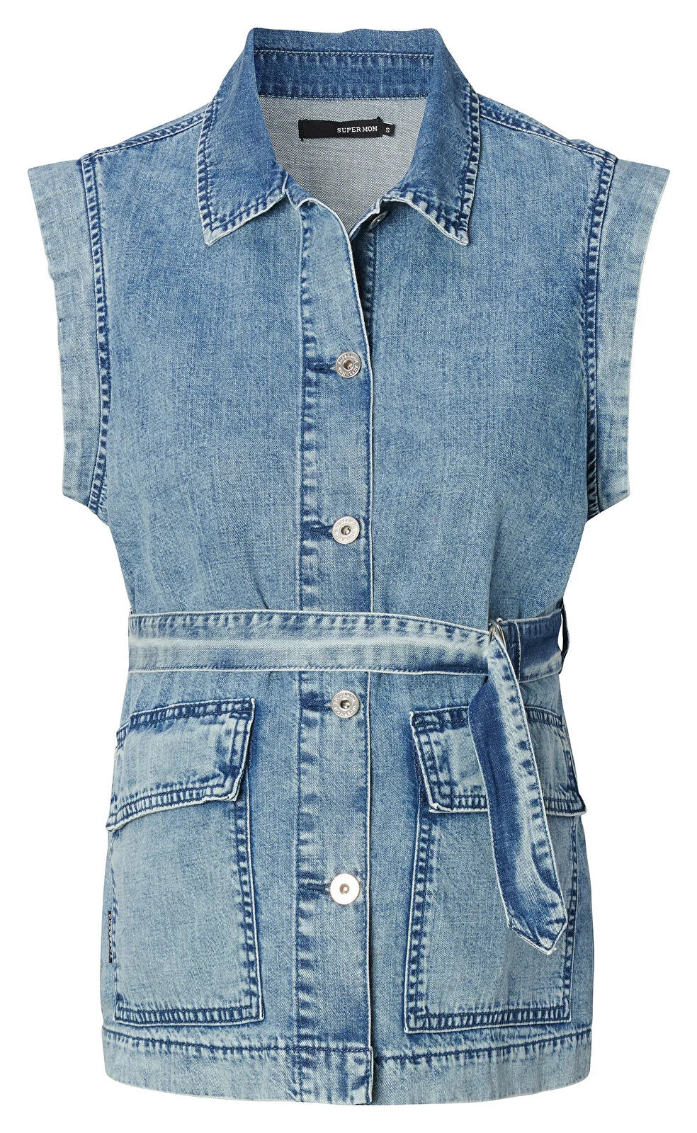 Cool sleeveless denim cardigan from the Supermom collection. The Ellisburg cardigan features a collar, pockets on the hips and a waist belt which will put some great extra emphasis on your growing belly.Product Type: Maternity Fashion