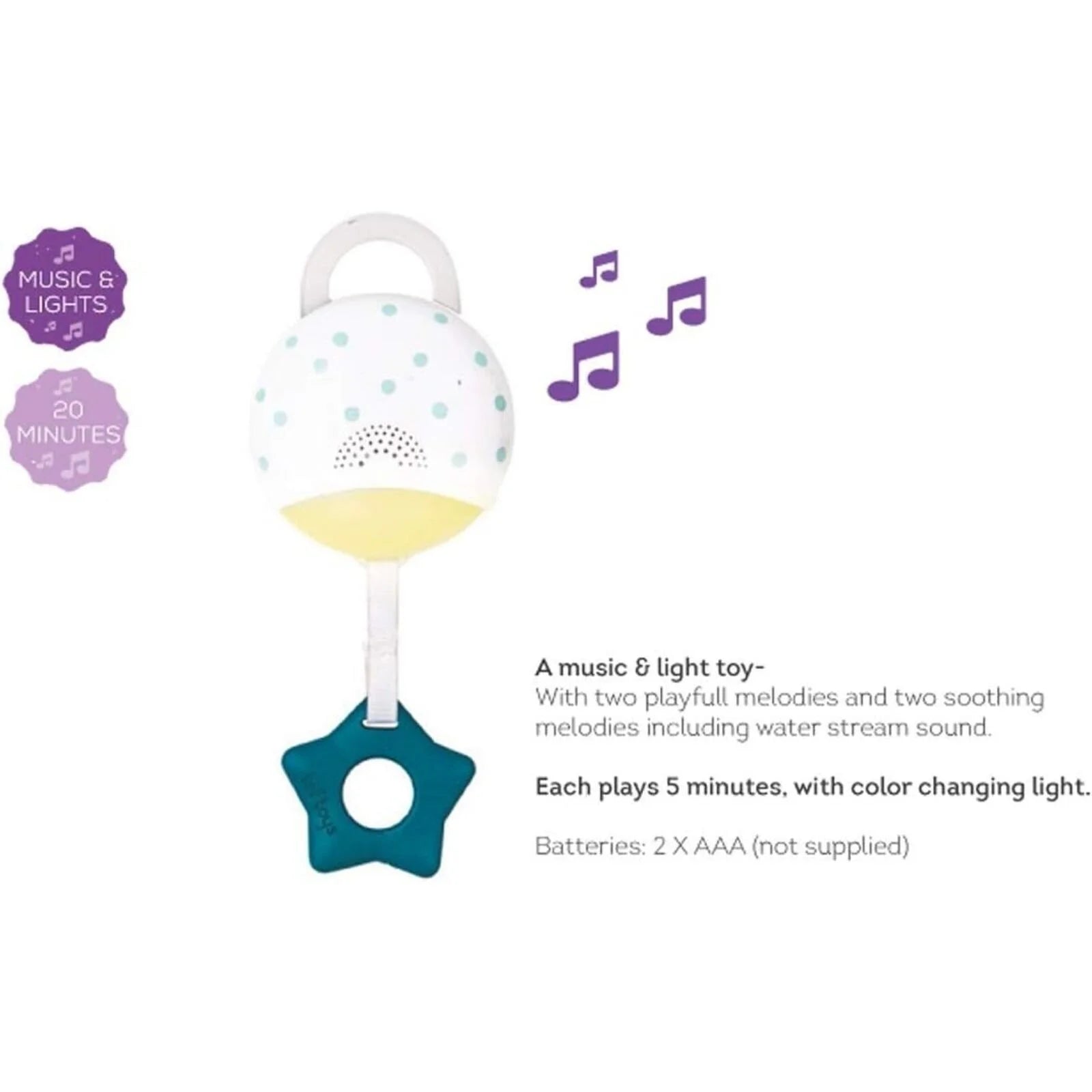 • Detachable music & light toy. Activated by your baby’s pull, playing 20 minutes of melodies including a lullaby, water stream sound, and two playful tunes.