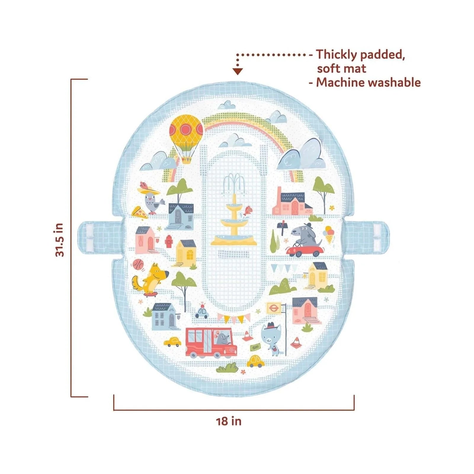 • Includes rattle shoes, plush animal toys (dog and pigeon), a large baby-safe mirror, and a traffic-themed tummy time pillow.